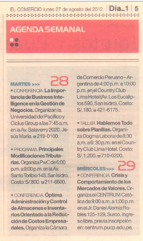 Diario Día 1Agenda semanalCONFERENCIA: La Importancia de Business intelligence en la Gestión de Negocios. Organizan la Universidad del Pacífico y Ciclus Group a las 7:45 a.m. en la Av. Salaverry 2020, Jesús María.